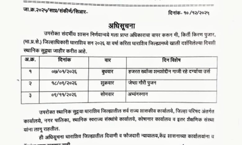 धाराशिव जिल्ह्यातील राज्य शासकीय कार्यालयांना तीन दिवसाचे सुट्टी जाहीर